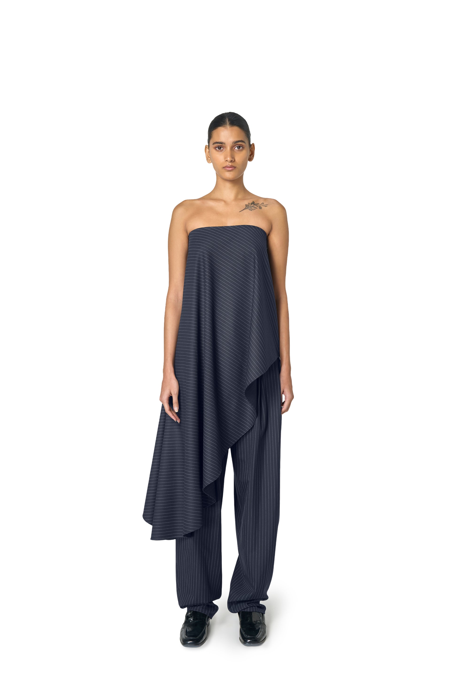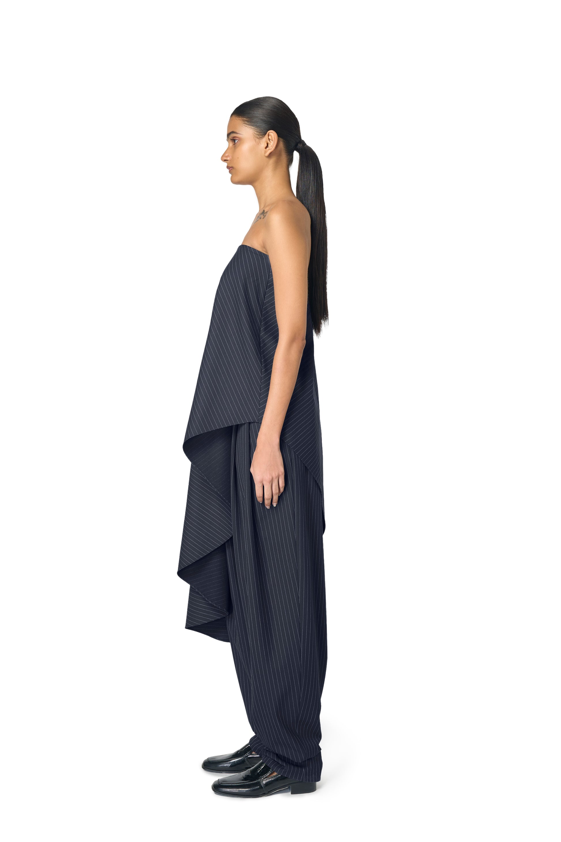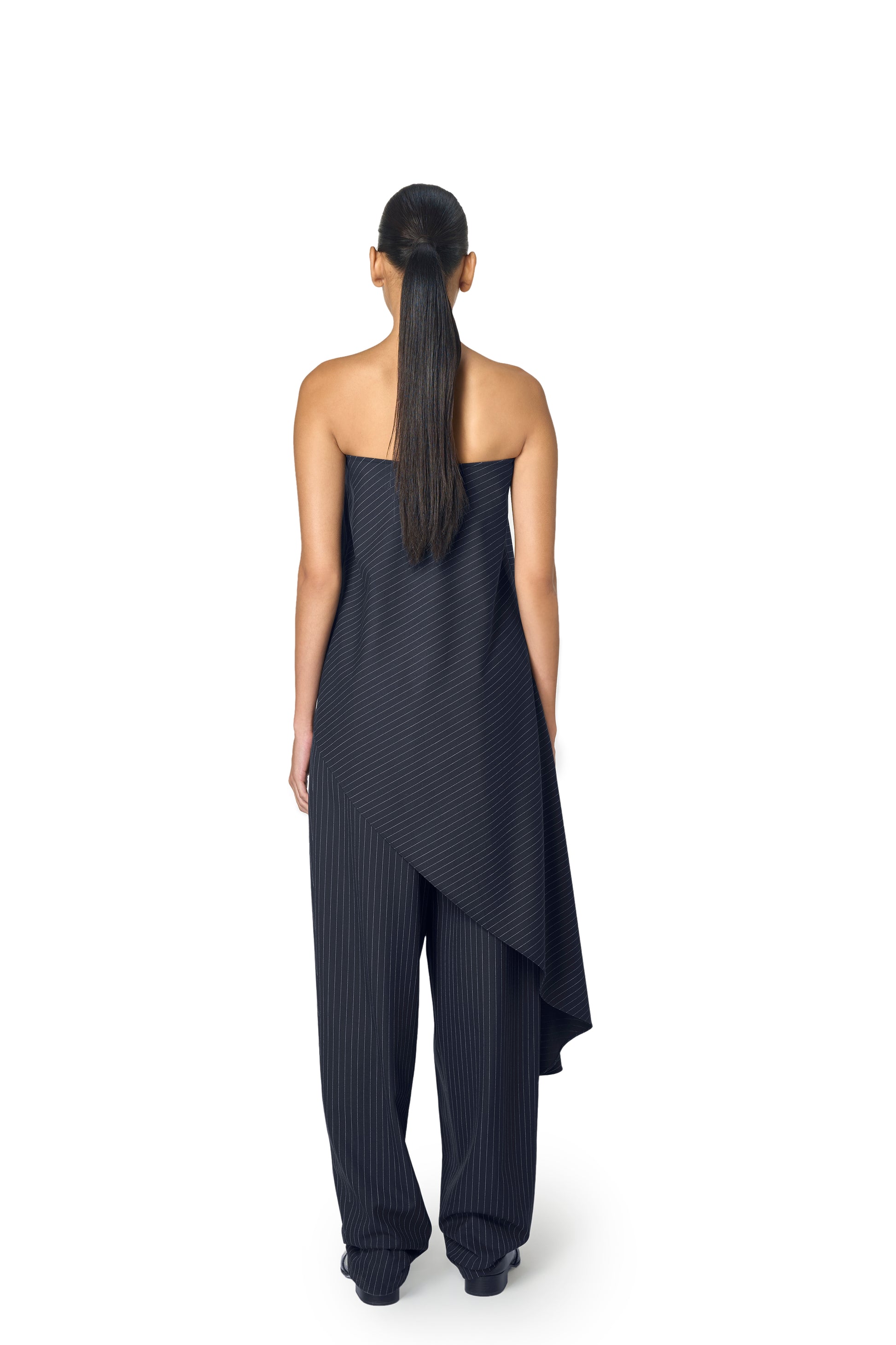Crafted from a fine pinstriped fabric, the Adrian Top features a strapless neckline and an asymmetric hem that falls to create a flattering drape. This is Ura's take on tailoring with a soft edge. Perfect for a day to night look.