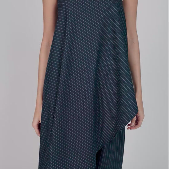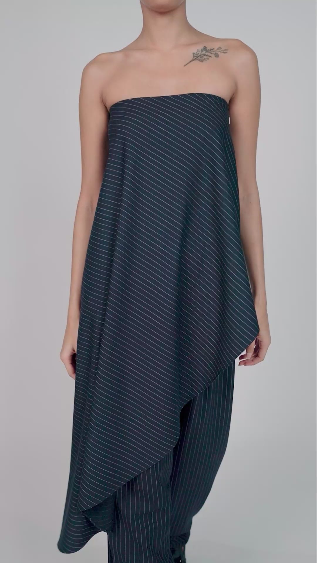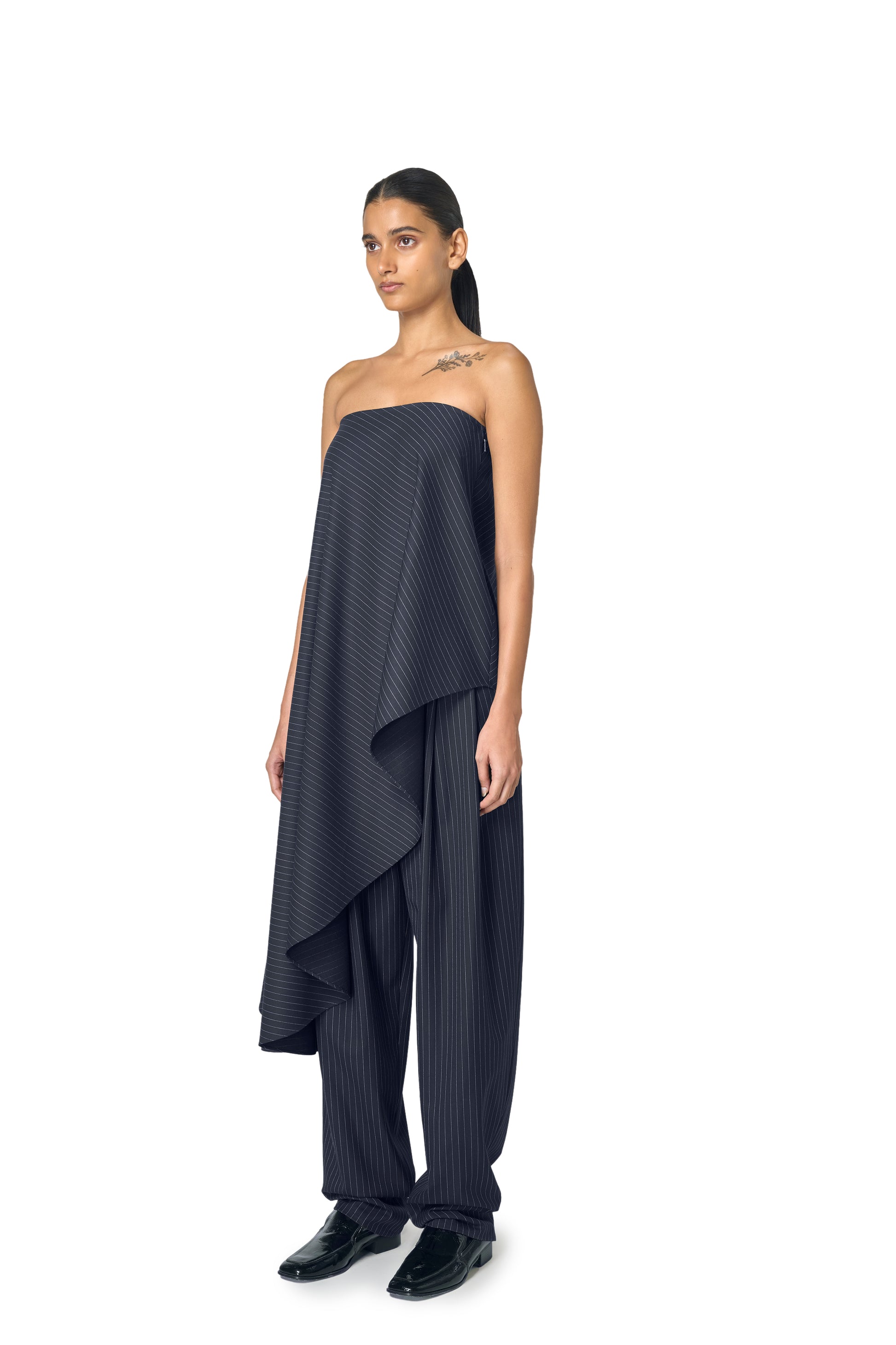 Crafted from a fine pinstriped fabric, the Adrian Top features a strapless neckline and an asymmetric hem that falls to create a flattering drape. This is Ura's take on tailoring with a soft edge. Perfect for a day to night look.