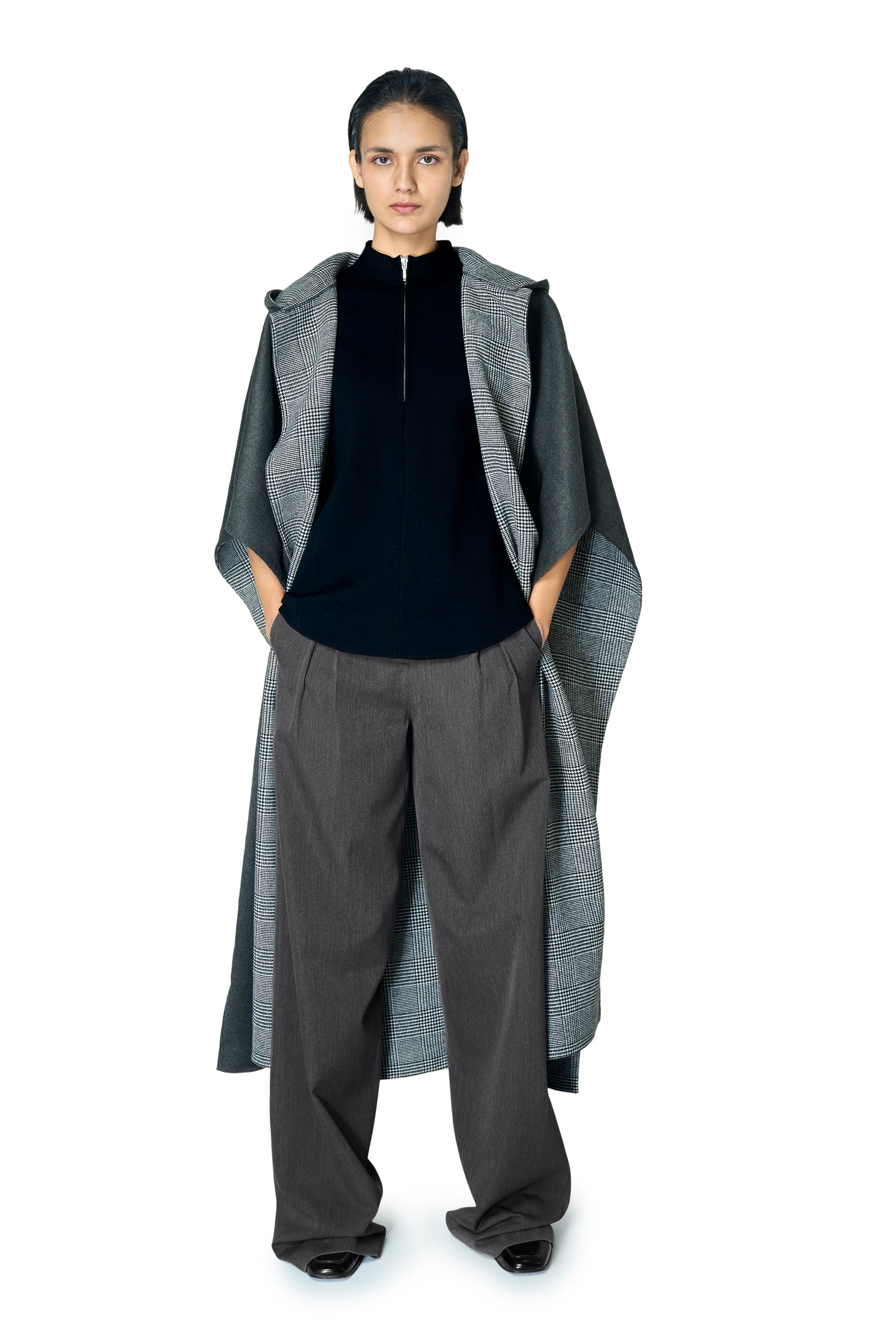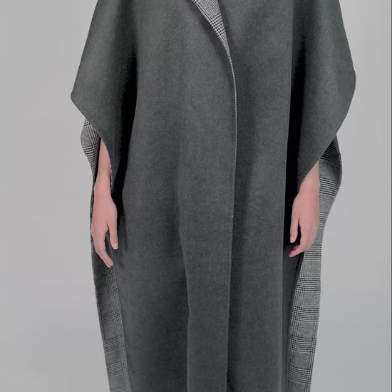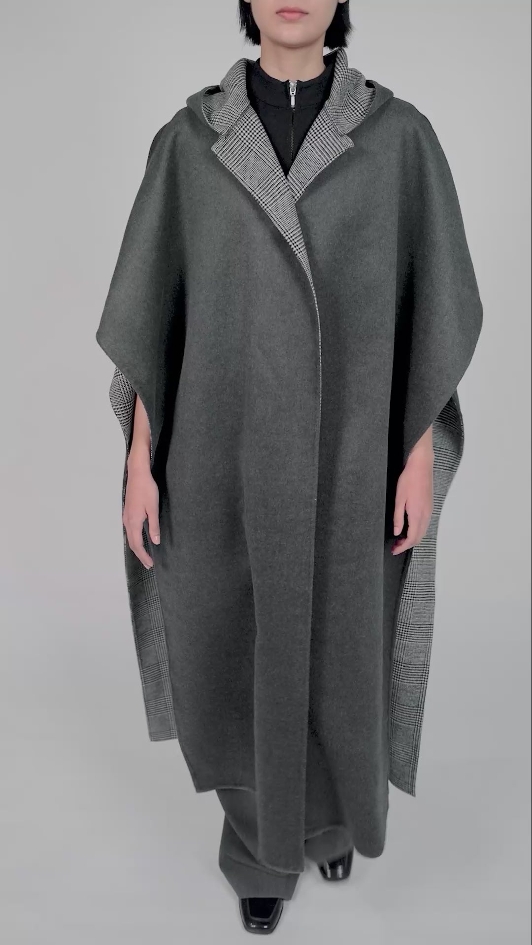 A striking layering piece where couture meets comfort. Tailored in a luxe wool blend, this hooded cape is reversible, with checks on the inside, and a solid grey on the outside. Wear it both ways and create a completely new look each time.