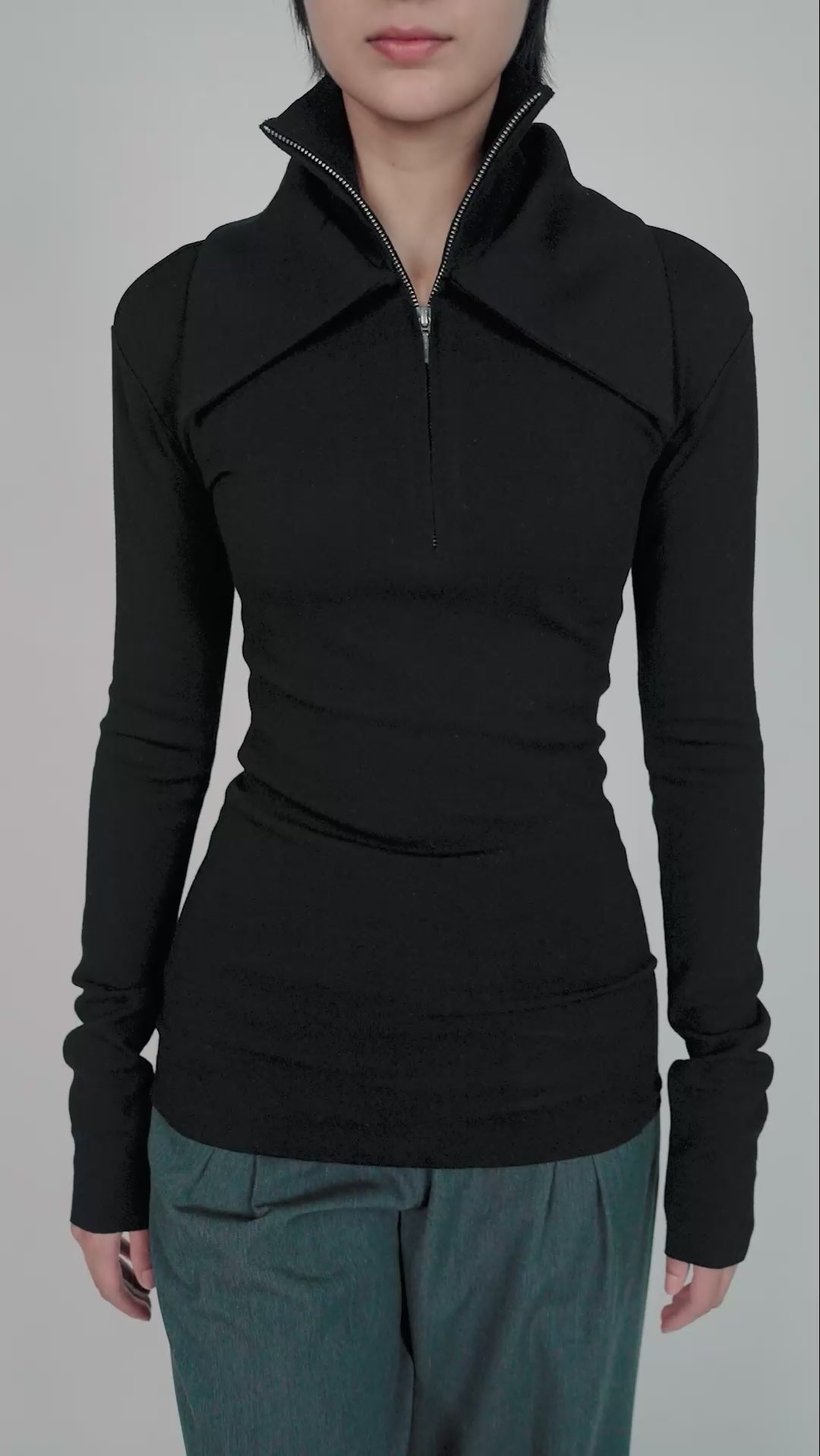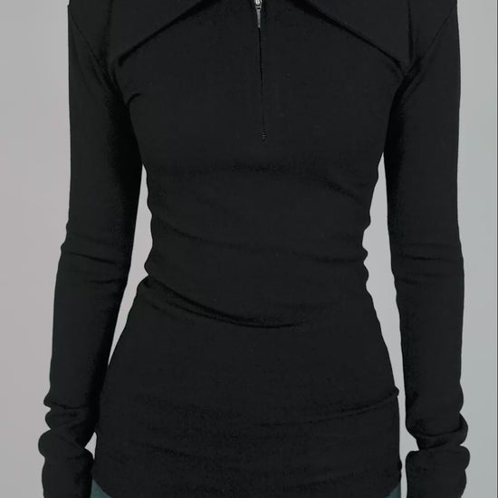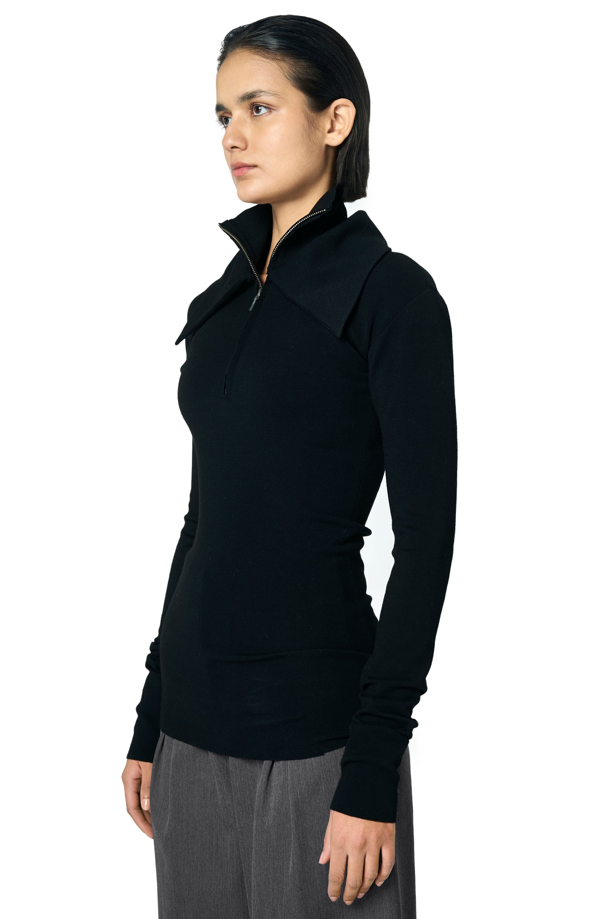 A cult favorite, revived in Black. Crafted from a cosy, wool fabric, and detailed with a double-layer collar that can be worn open polo-style or zipped up to create a high neckline.