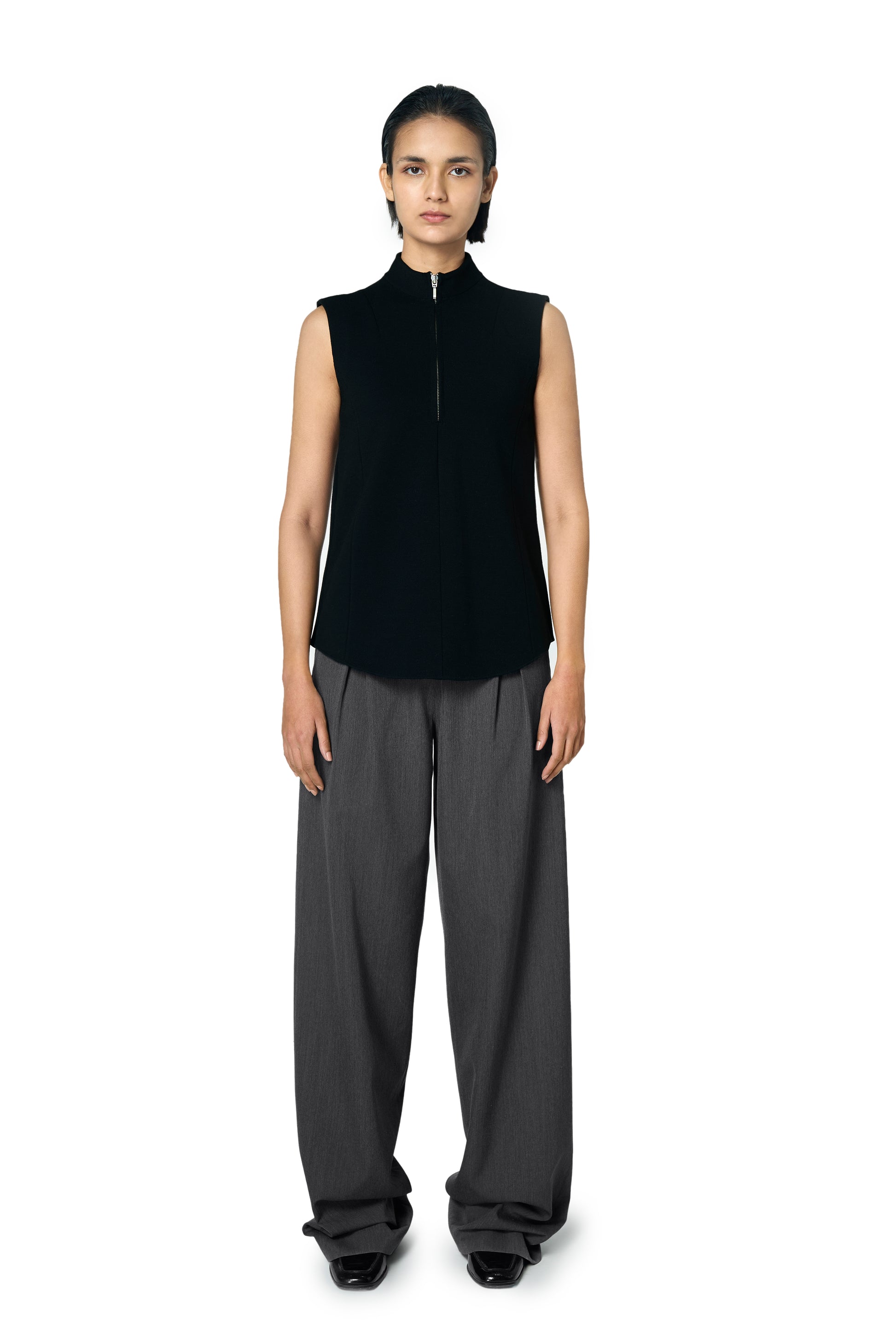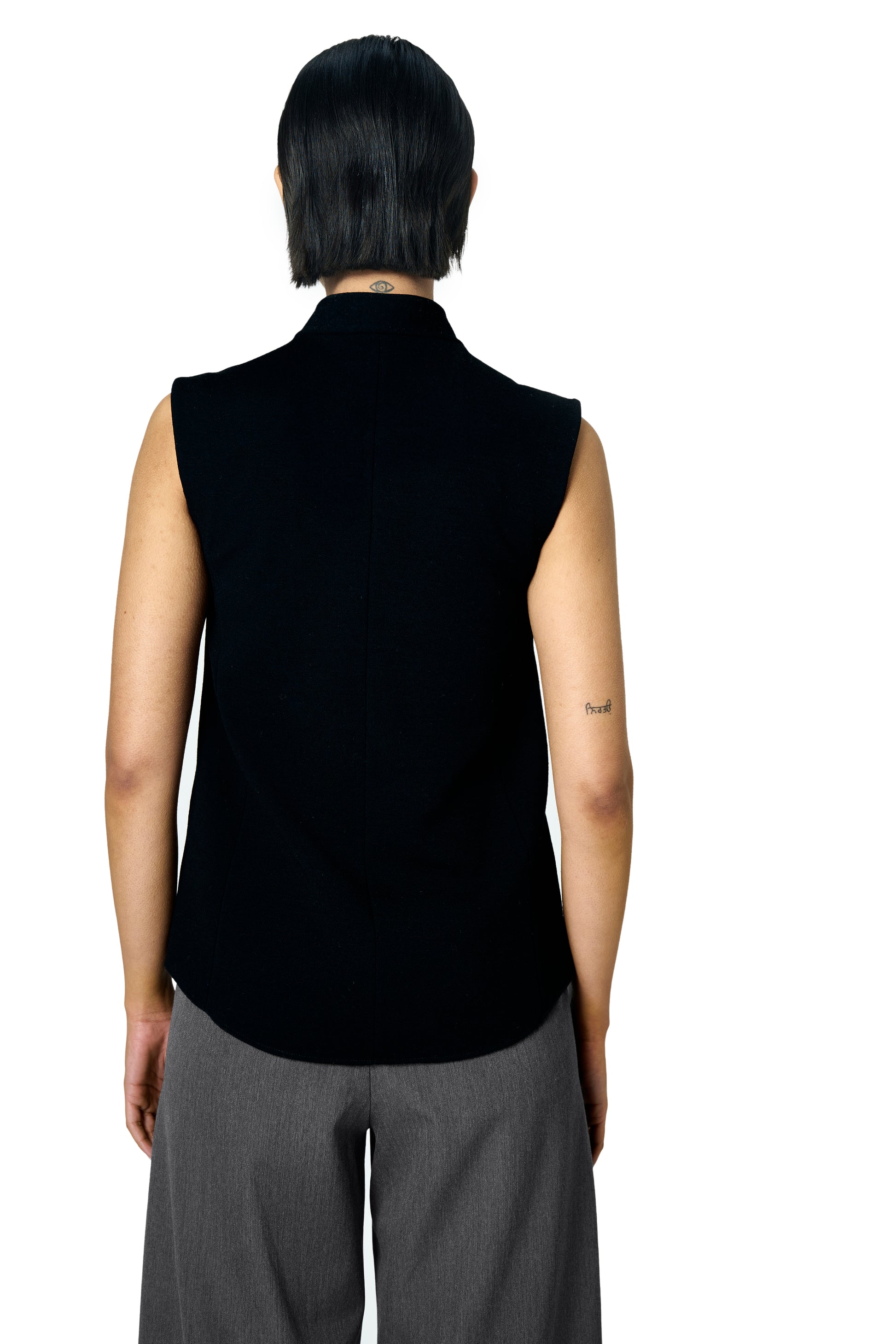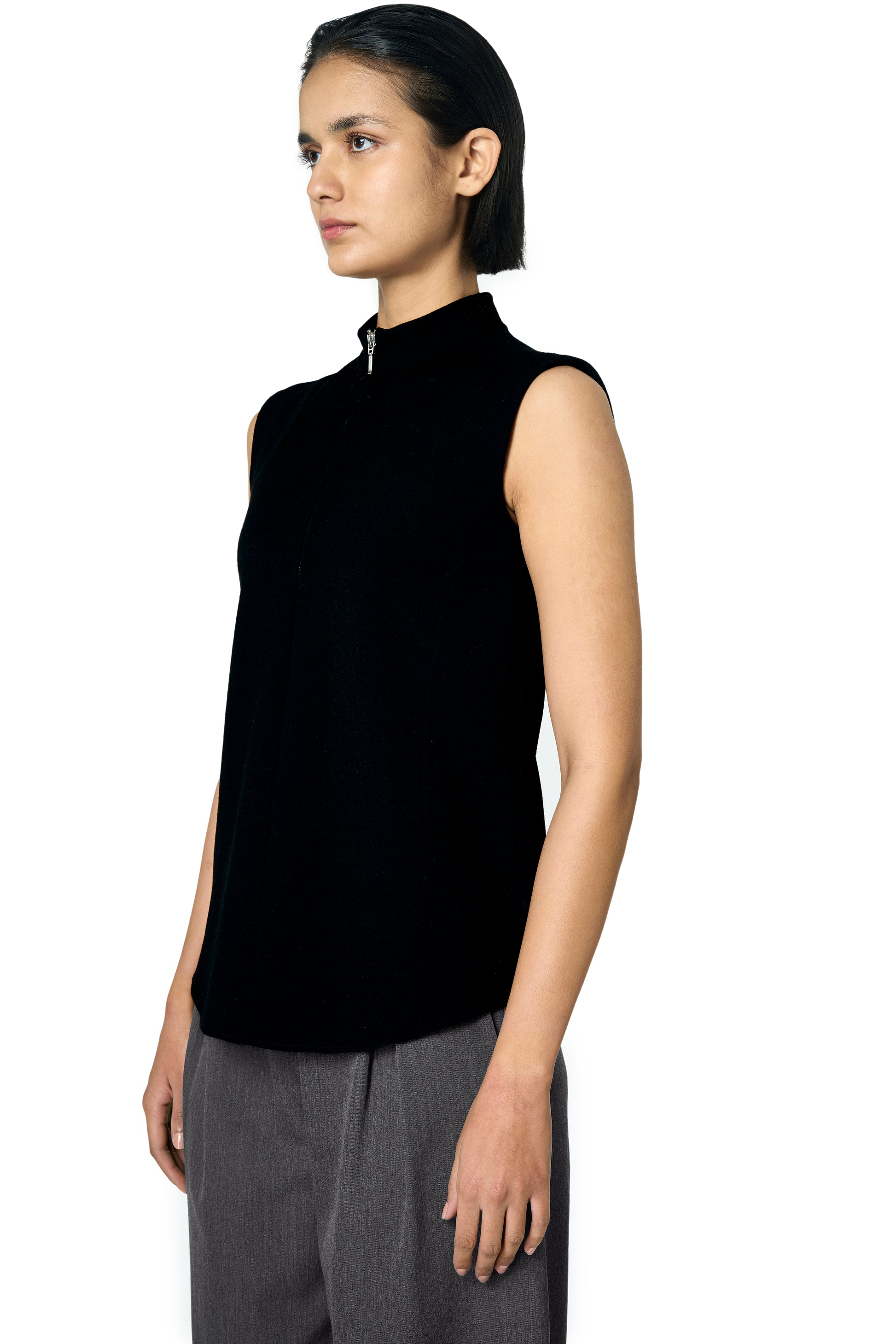 Designed with a high neck and front zip detail, it balances utility with refinement. A sleeveless black top with a clean, structured silhouette.