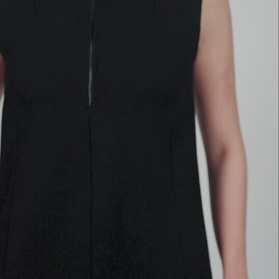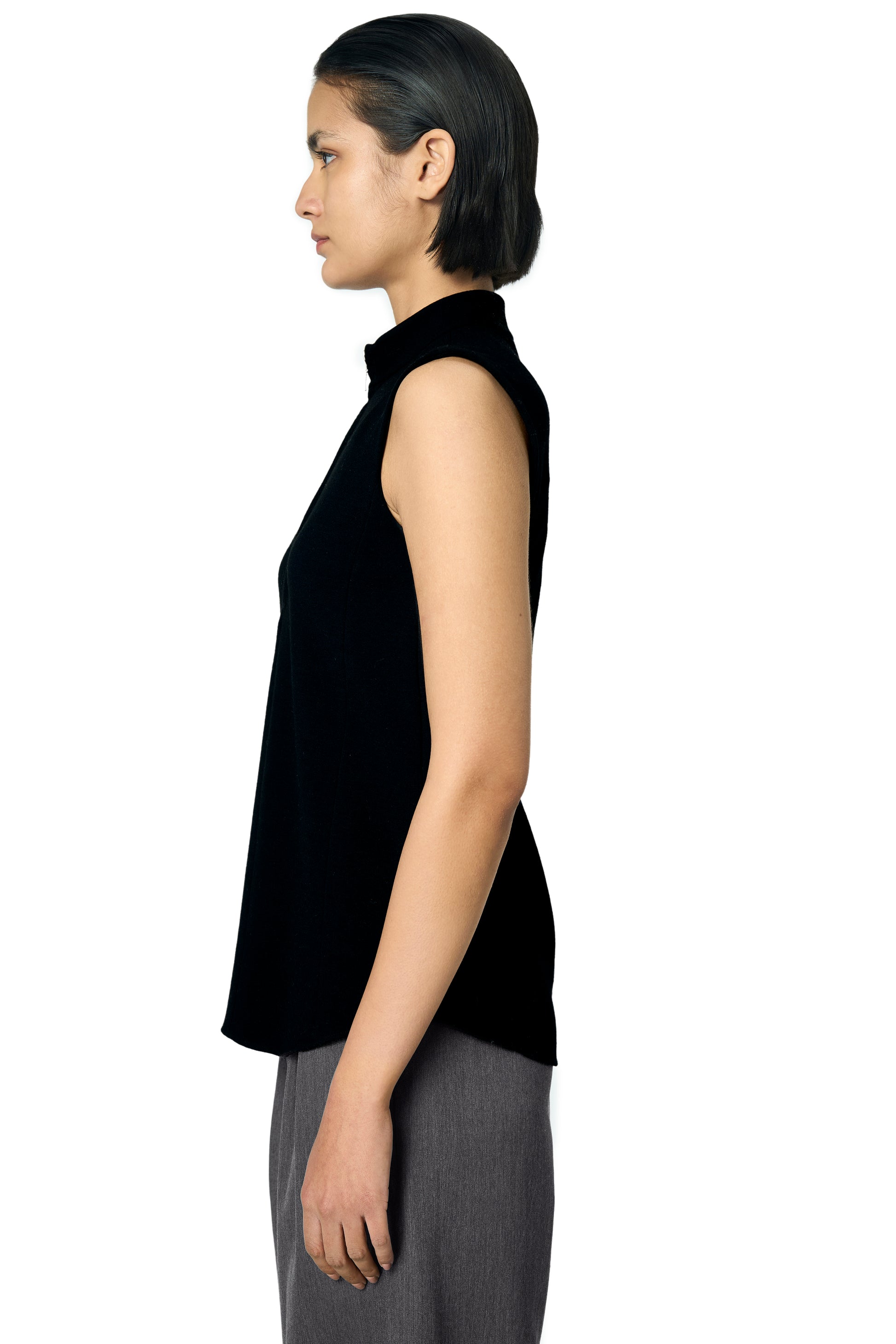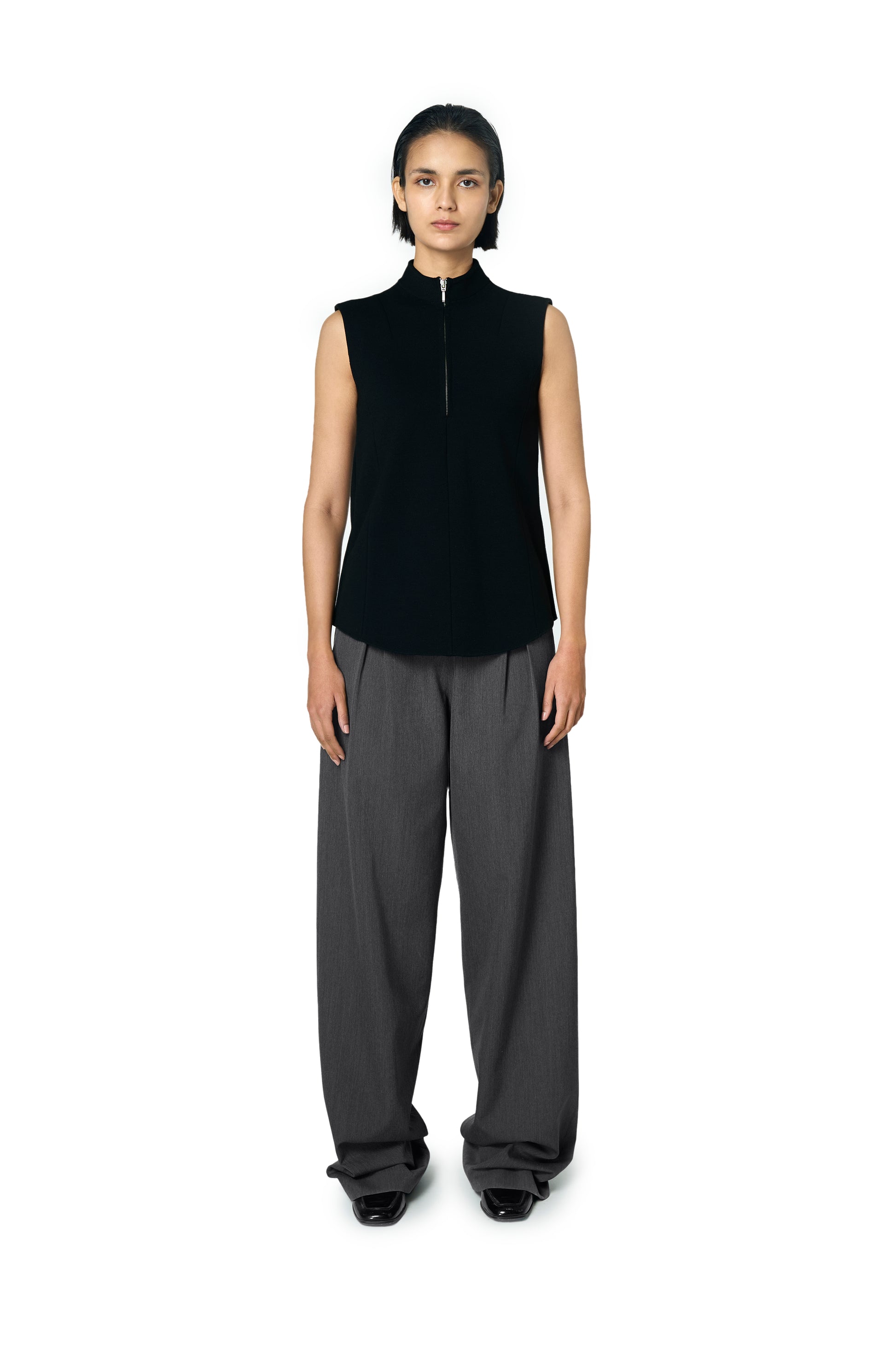 Designed with a high neck and front zip detail, it balances utility with refinement. A sleeveless black top with a clean, structured silhouette.