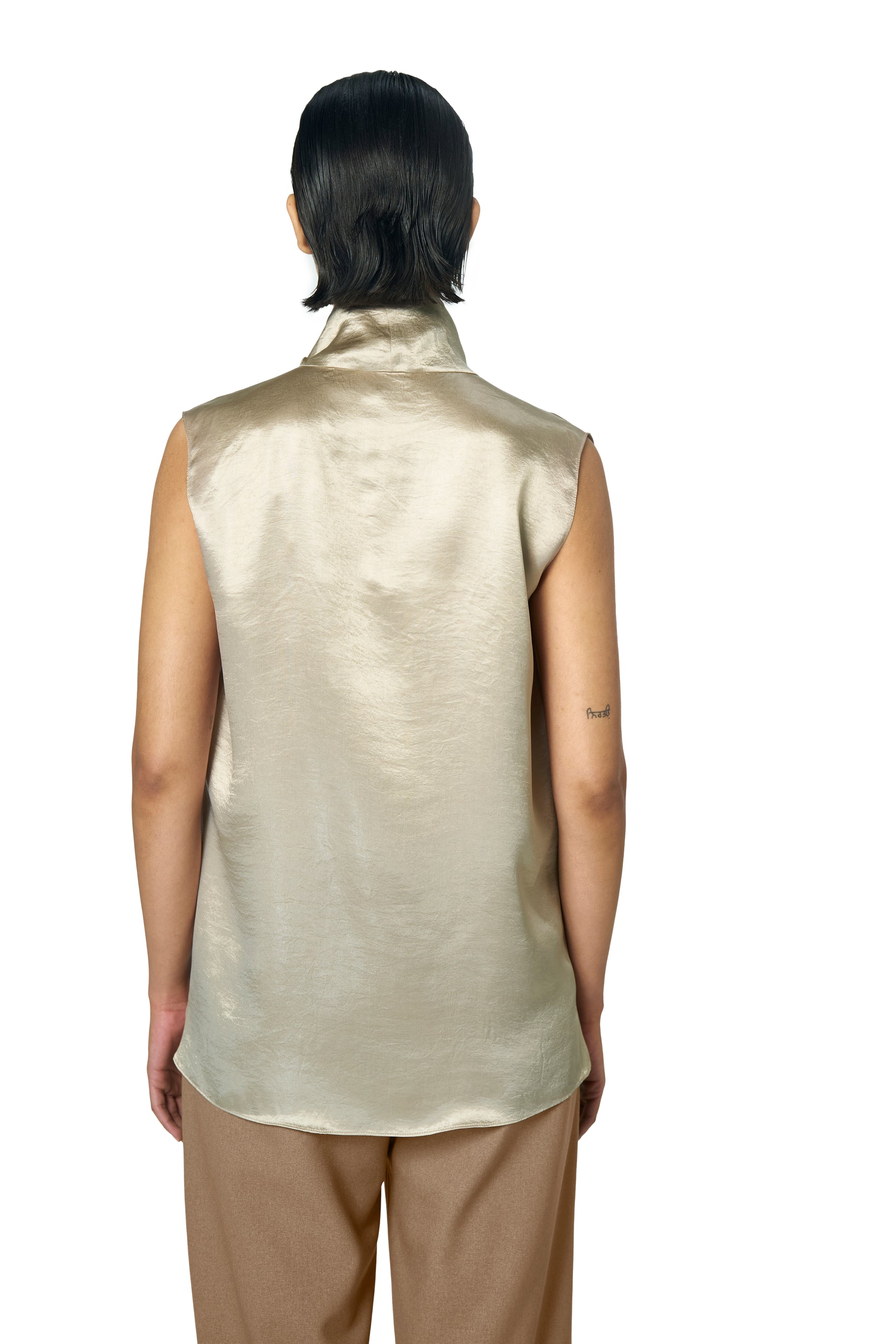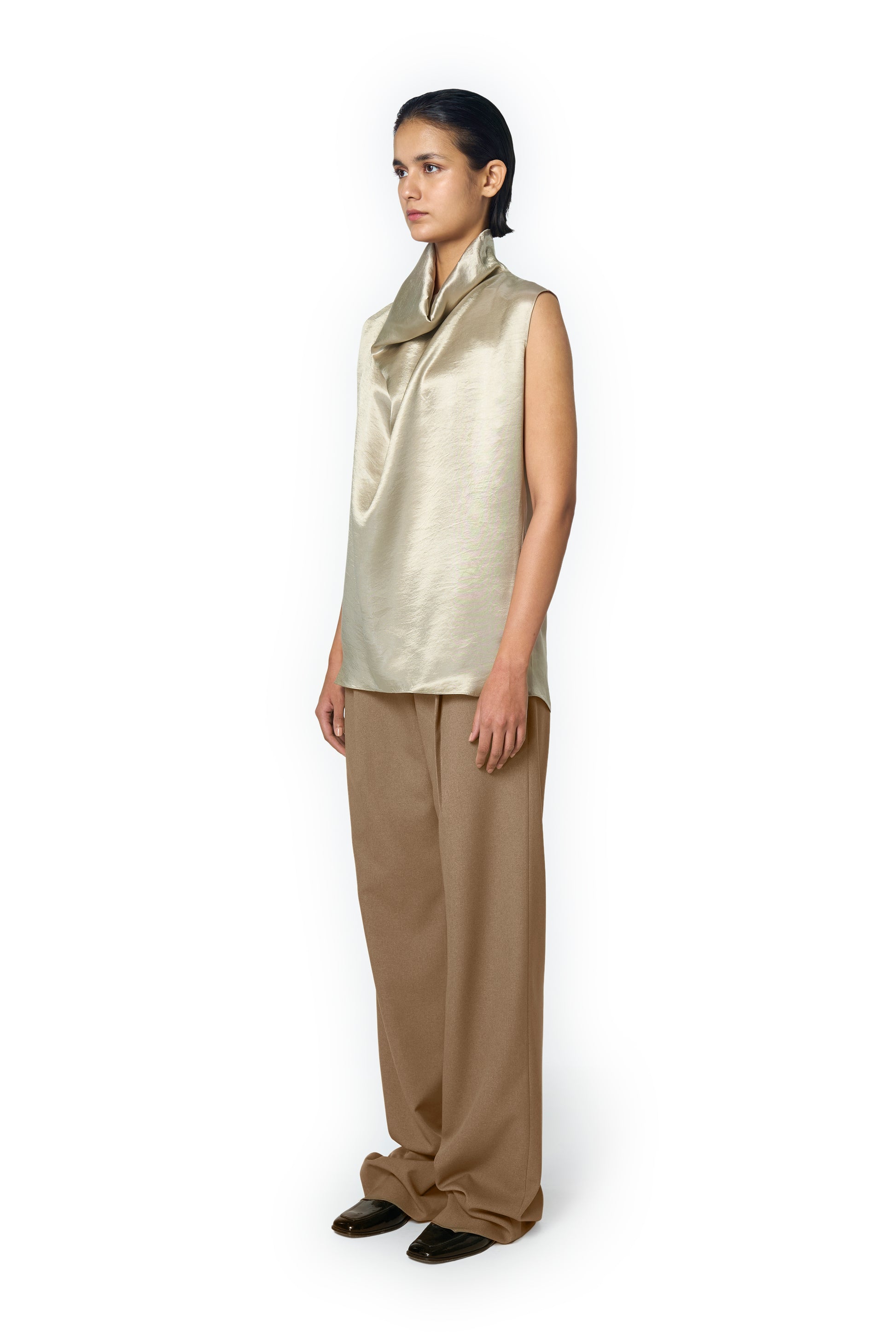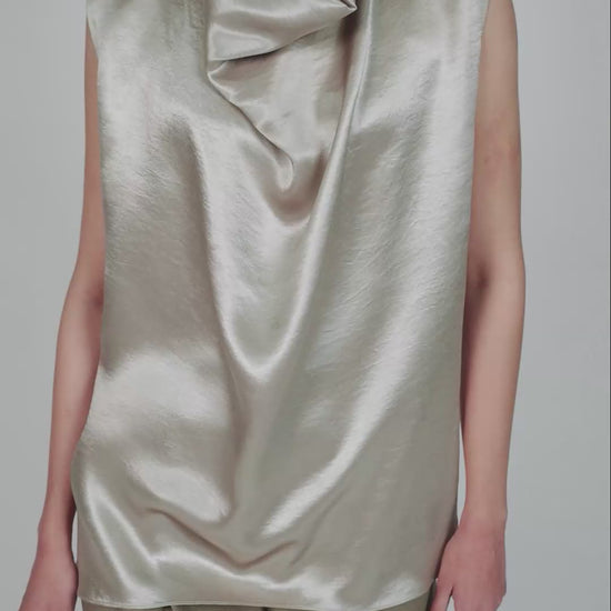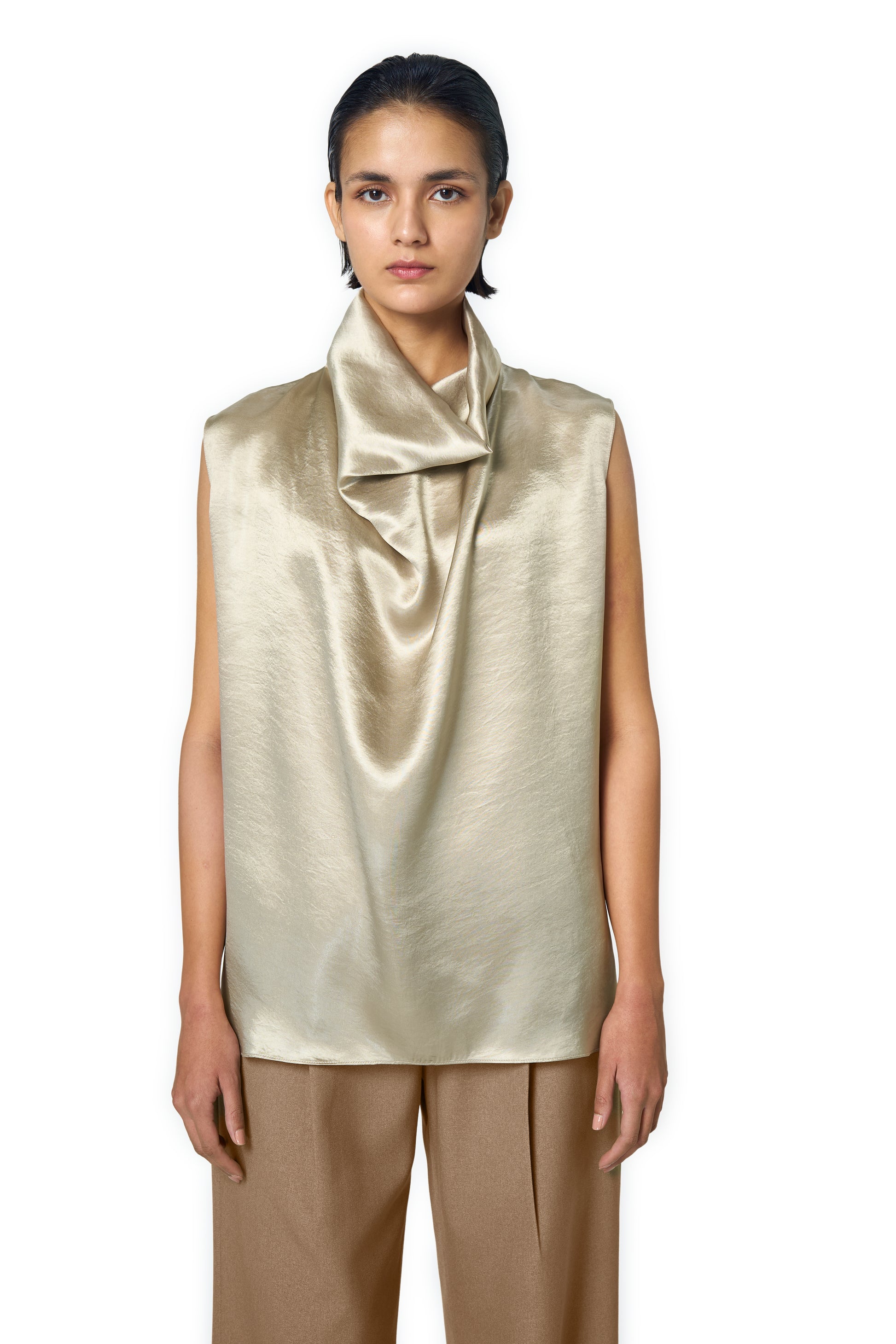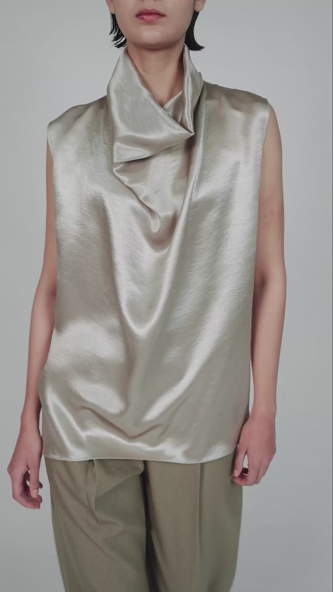 Defined by its lush, draped neckline, this sleeveless top brings sculptural fluidity to a minimal silhouette. Cut in a luminous fabric, it falls with ease on the body, offering a balance of refinement and relaxed movement.