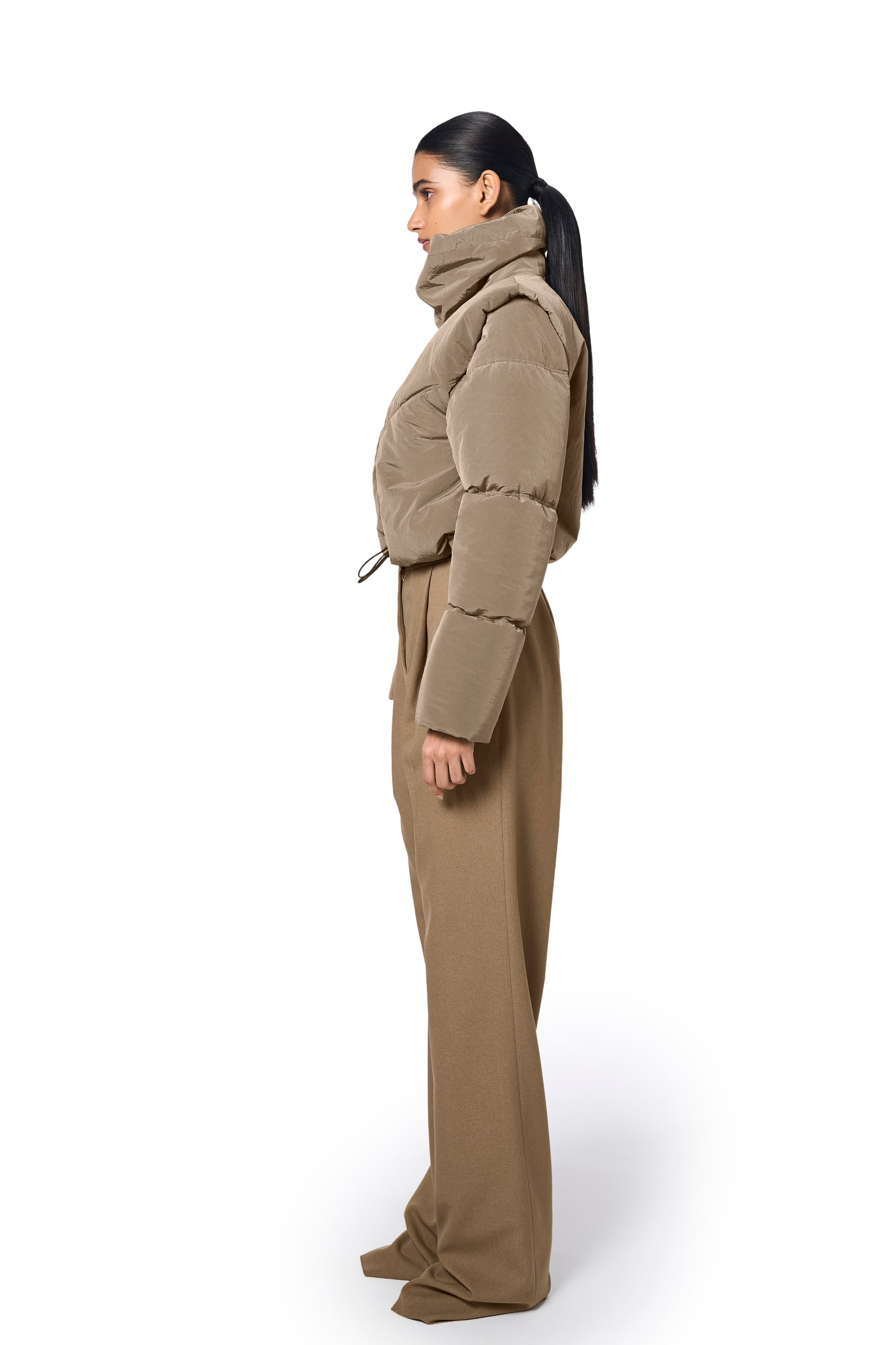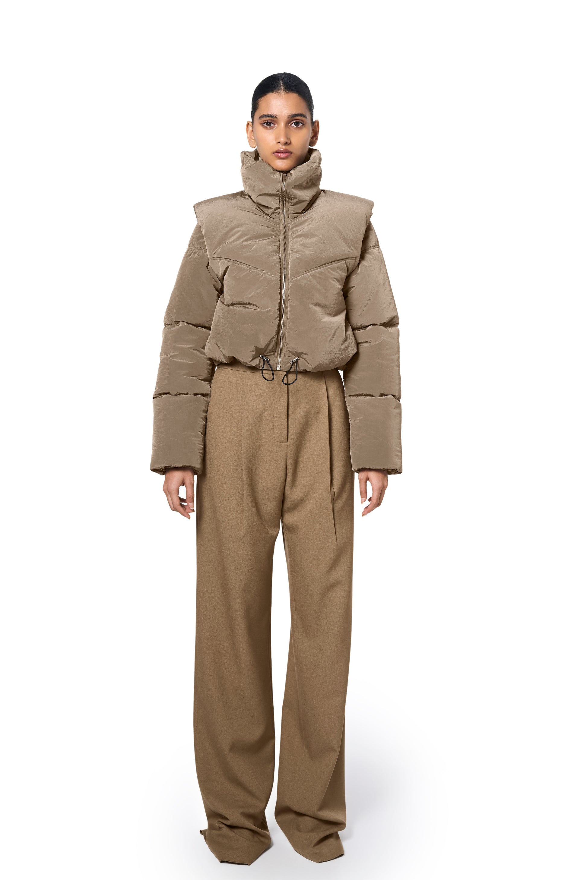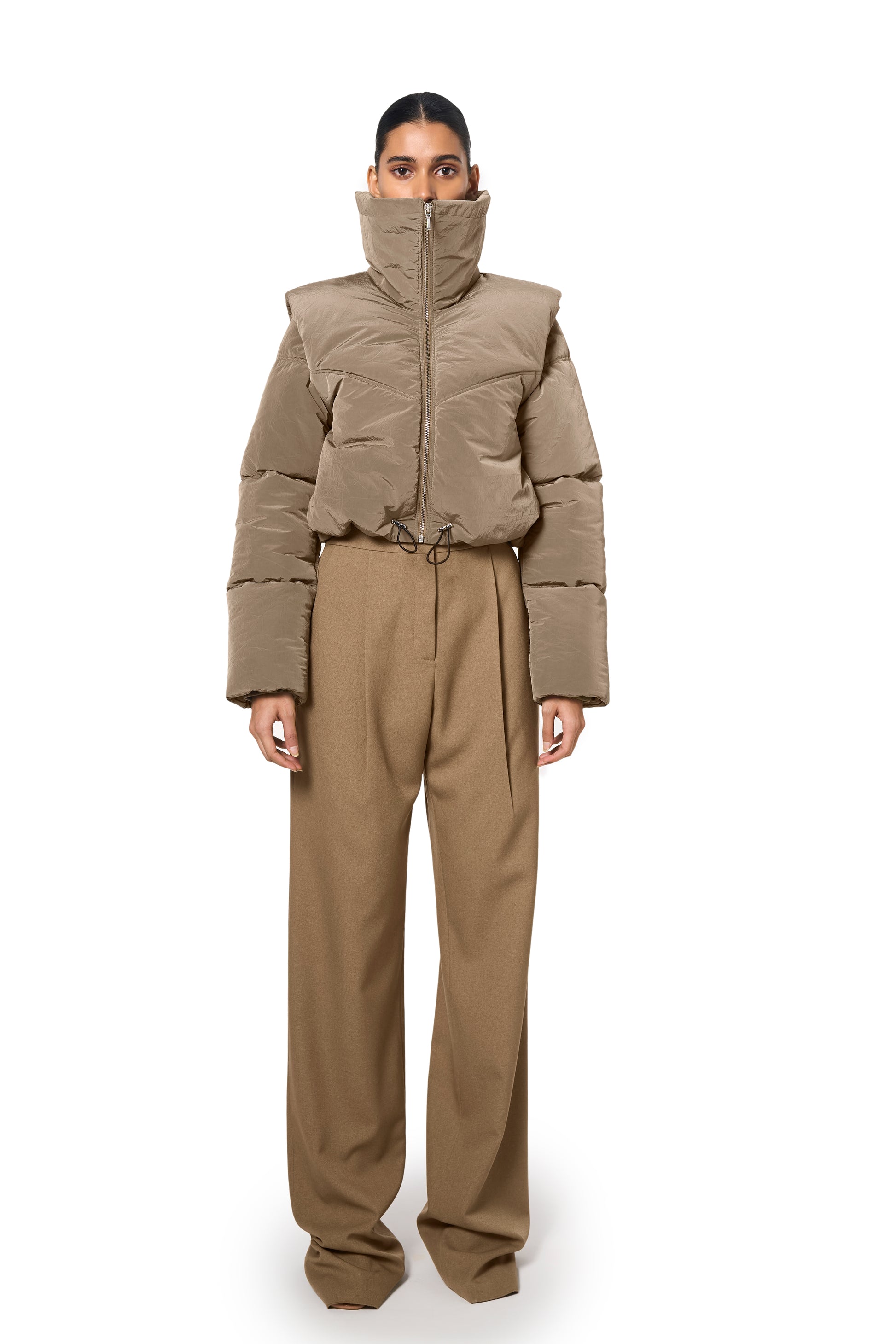 Ura's bestselling Pat Bomber is revisited in a luxe, technical fabric. The cropped length bomber jacket features a front metal zipper closure and a padded design for added warmth. Its wide collar enhances the stylish look, while the sage colour makes it a staple, easy to layer piece in your wardrobe. Comes with adjustable pullers at the hem.