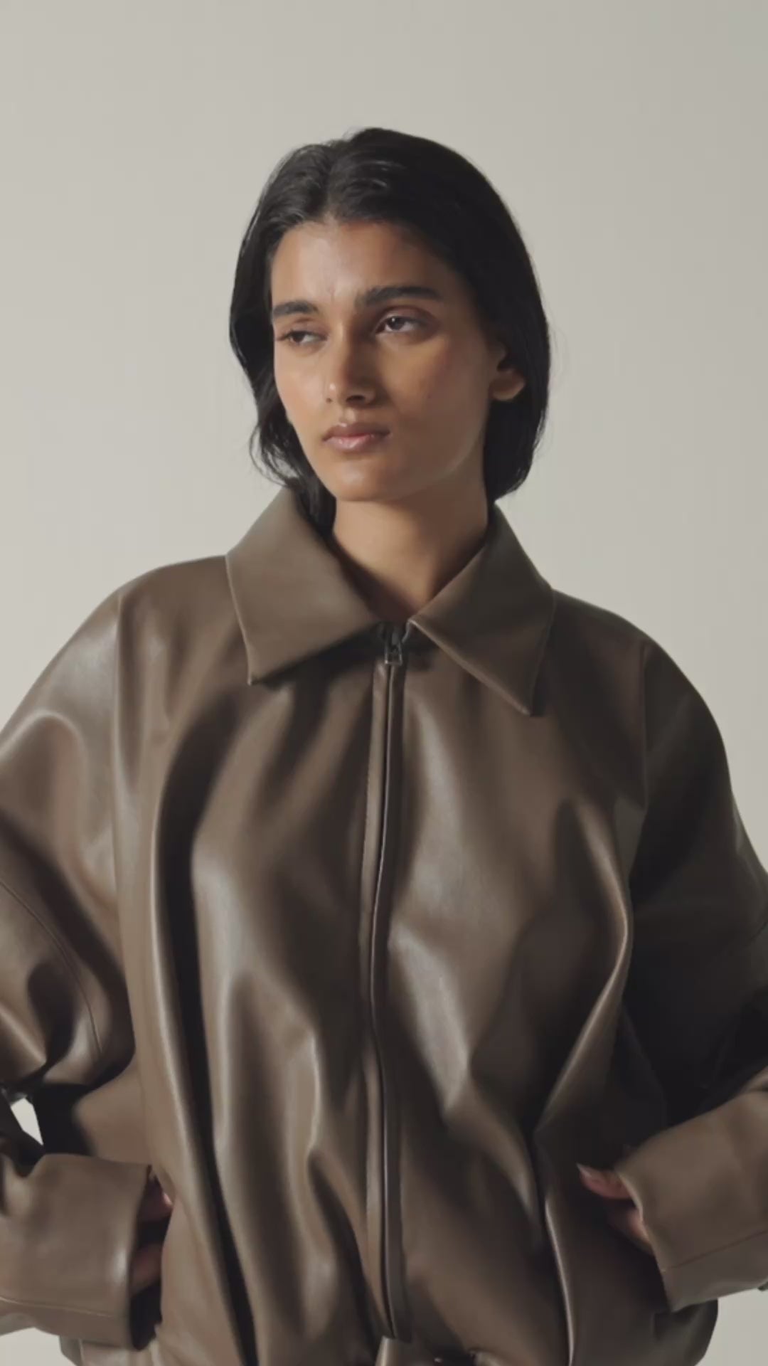 Crafted from a soft vegan leather, the jacket is a relaxed bomber style in a rich brown color. It has a soft, supple feel, with an oversized fit, dropped shoulders, and voluminous sleeves. A luxe leather belt tie cinches the waist, creating a bloused shape.