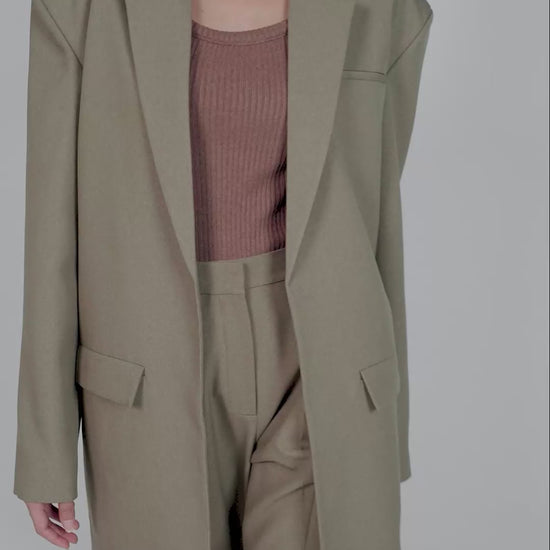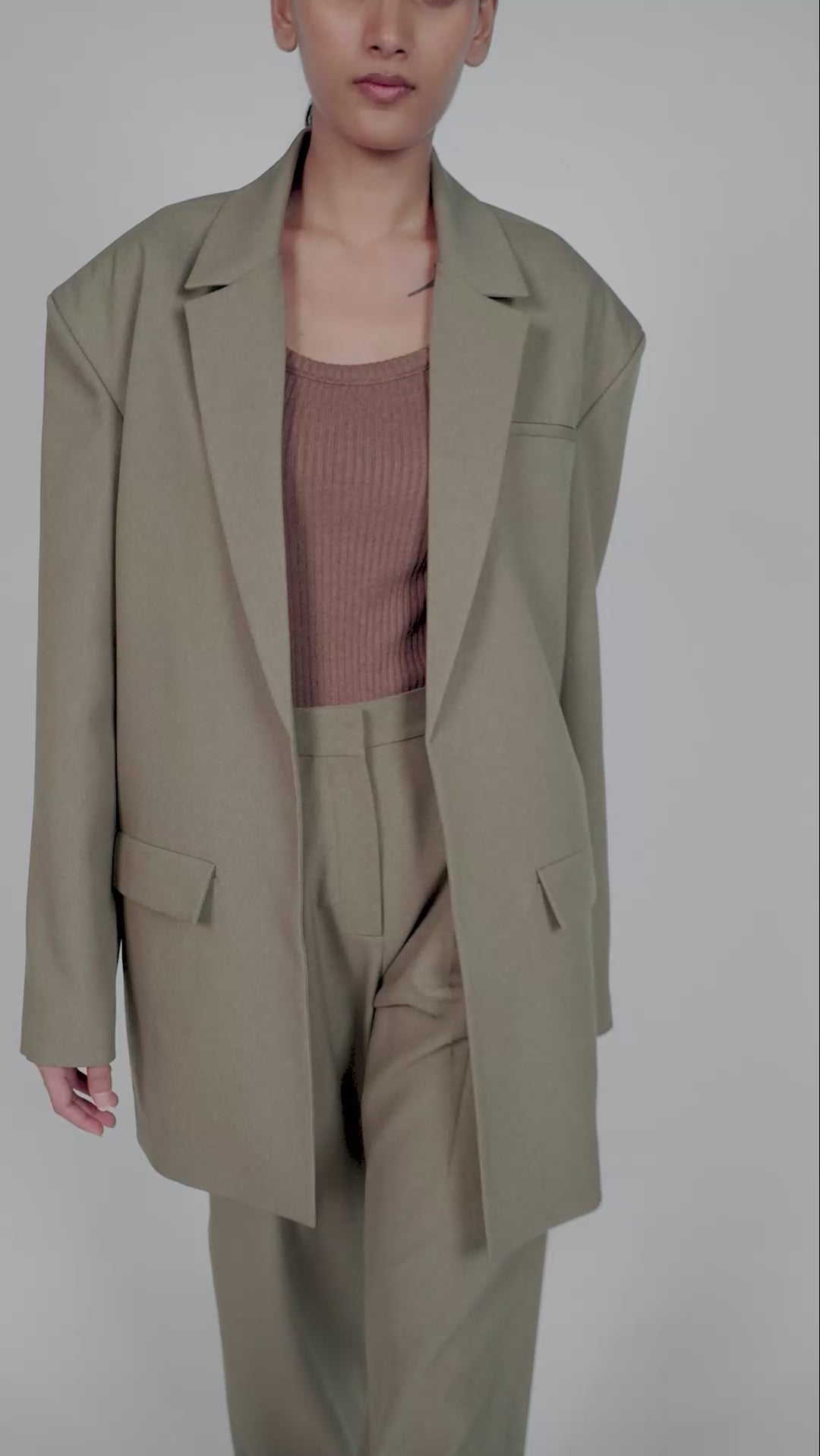 An oversized blazer in a warm camel color. Its most striking feature is the structural, broad shoulders, which give it a powerful look. The design includes two large flap pockets at the front, combining classic tailoring with a modern, dramatic fit. Pair it with the Toni Trousers for a complete look.