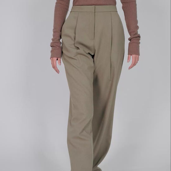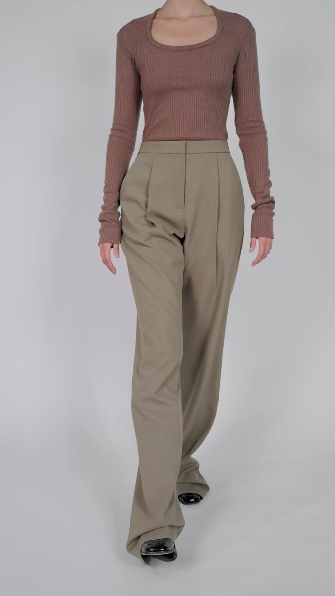 High-waisted, wide-leg trousers in a warm camel color. The trousers feature elegant pleats at the waistline, which provide a relaxed and comfortable fit, while the wide-leg silhouette drapes to the floor for a modern, elongated look. Pair it with the Toni Top or Toni Blazer for a coordinated look.